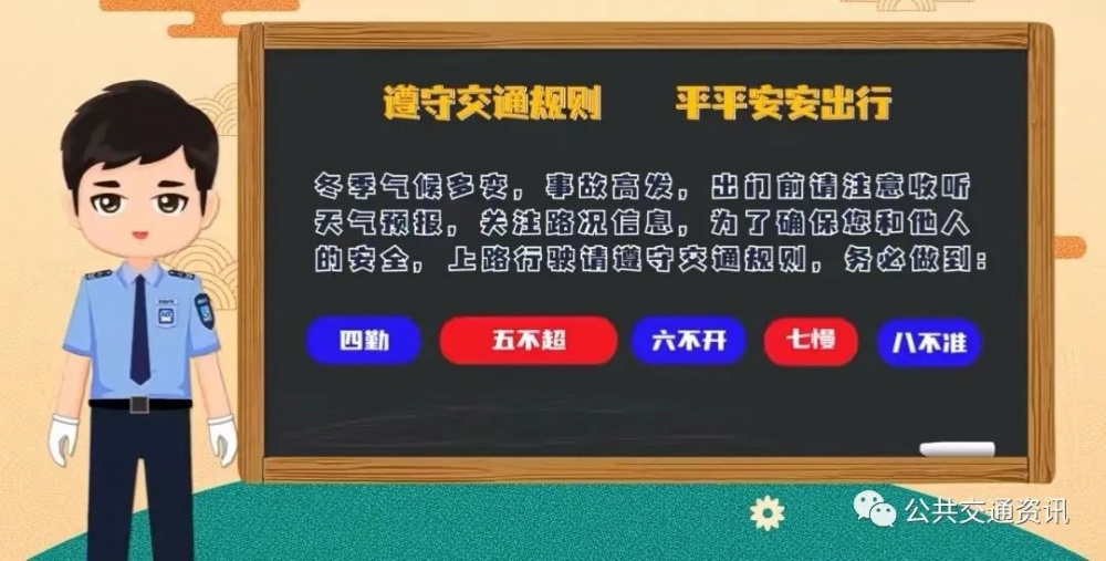 冬季氣候多變,事故高發(fā),出門前請注意收聽天氣預報,關(guān)注路況信息,為了確保您和他人的安全, 上路行駛請遵守交通規(guī)則,務必做到:四勤、五不超、六不開、七慢、八不準 。