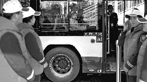 公交人下班后輪流在站臺當起志愿者。晨報記者 王巍/攝