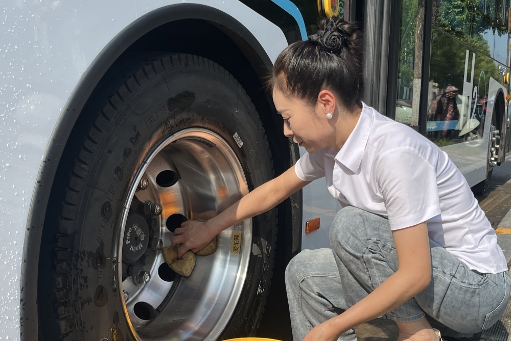 大太陽(yáng)底下,他仔細(xì)檢查每一處,就為了保障公交車能順順當(dāng)當(dāng)跑。