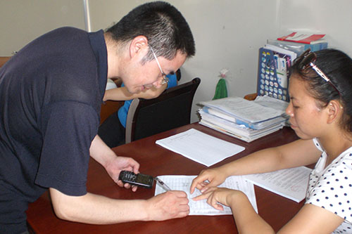 圖5為工作人員為愛心助考車粘貼活動標(biāo)識